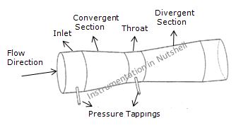 The high-pressure tap is taken at the inlet section and the low-pressure tap is located in the middle of the throat.