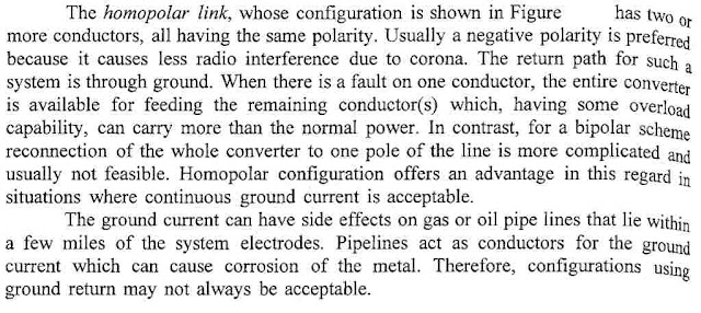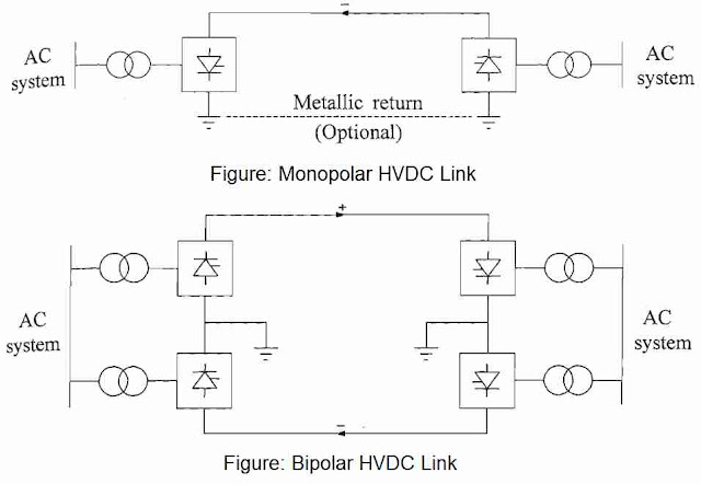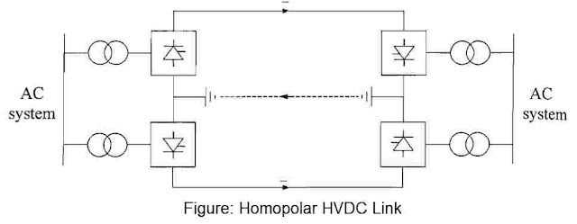 The basic configuration of a monopolar link is shown in the figure. It uses one conductor, usually of negative polarity. The return path is provided by ground or water. Cost considerations often lead to the use of such systems, particularly for cable transmission. This type of configuration may also be the first stage in the development of a bipolar system.