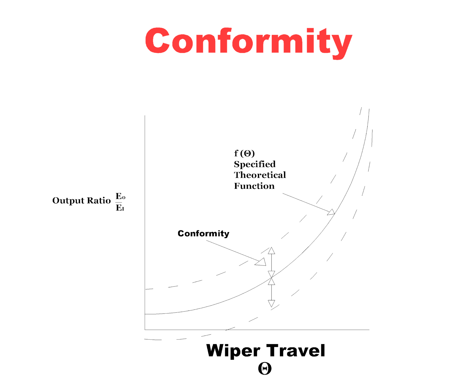 Eo is the output voltage, E1 is the input voltage and f (Θ) is the theoretical output function of the potentiometer. This function is specified with deviation from the theoretical function. This deviation of the output curve is conformity.