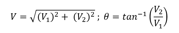 This potentiometer measures the unknown EMF in certasian form. The two components along and perpendicular to some standard axis which are measured by two different scales which are known as in phase V1 and quadrature V2 scales. The formula to find the unknown voltage by this potentiometer is given below: