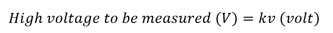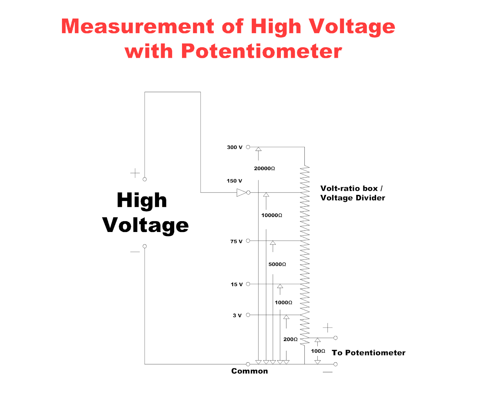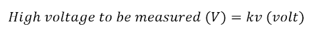 High voltage are applied to the input terminal of the volt-ratio box/voltage divider and these high voltage leads to the potentiometer through the voltage divider and the two points are taken by the potentiometer from the volt-ratio box. The high voltage are measured by the potentiometer. The formula to measure the high voltage is given below: