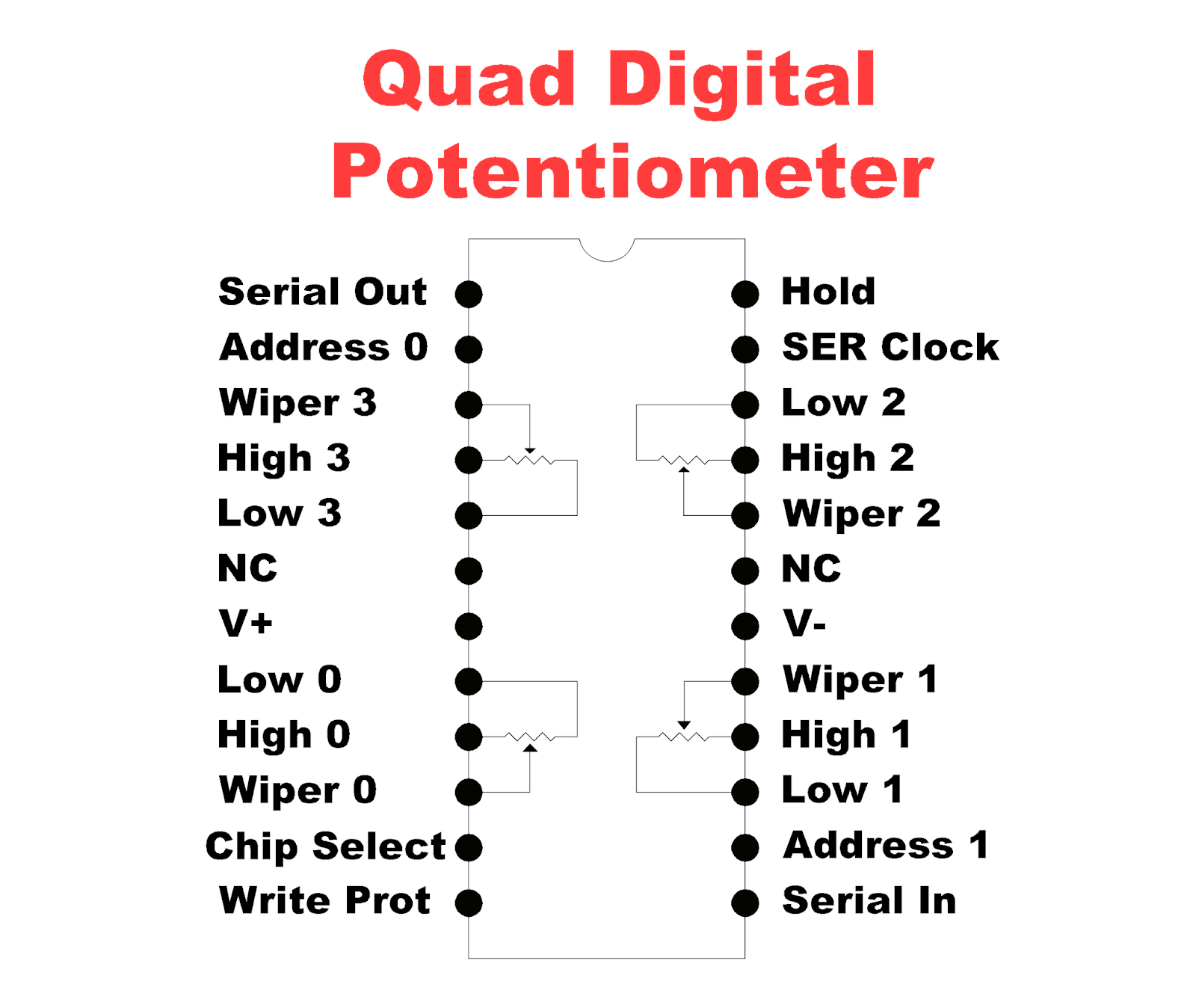 It is a mixed signal device which enable digital control of a variable voltage. Digital potentiometers are also known as digitally adjustable potentiometer, digi-pot or digital programmed potentiometer. This is an integrated circuit chip which works by means of programming. These potentiometers are used for the adjustment of the pulse width of an oscillator. Digital potentiometer consists of a ladder resistances and it allows access to each end of the ladder through two pins as a high and low. The high pin is numbered 1 and the low pin is numbered 1. These potentiometers are designed for 5v supply or less.