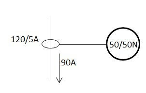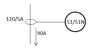 The single diagram shows a very simple and typical line, through which 90A current is flowing, and a CT of rating 120/5A is connected via which the 51 and 51N relays are connected.