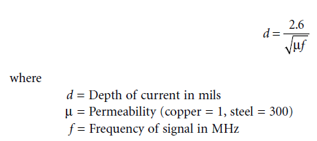 It can be calculated that at a frequency of 100 kHz, current flow penetrates a conductor by 8 mils. At 1 MHz, the skin effect causes current to travel in only the top 2.6 mils in copper, and even less in almost all other conductors. Therefore, the series impedance of conductors at high frequencies is significantly higher than at low frequencies. The figure shows the distribution of current in a radial conductor.