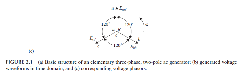 Figure 1(a) shows the structure of an elementary three-phase and two-pole ac generator (also called an alternator). Its structure has basically two parts: the stationary outside part which is called the stator and the rotating inside part which is called the rotor. The field winding is located on the rotor and is excited by a direct current source through slip rings located on the common shaft. Thus, an alternator has a rotating electromagnetic field; however, its stator windings are stationary. The elementary generator is shown in Figure (1)a has three identical stator coils (aa’, bb’, and cc’), of one or more turns, displaced by 120° in space with respect to each other. If the rotor is driven counterclockwise at a constant speed, voltages will be generated in the three phases according to Faraday’s law, as shown in Figure (1)b. Notice that the stator windings constitute the armature of the generator (unlike dc machines where the armature is the rotor). Thus, the field rotates inside the armature. Each of the three stator coils makes up one phase in this single generator. Figure (1)b shows the generated voltage waveforms in the time domain, while Figure (1)c shows the corresponding phasors of the three voltages. The stator phase windings can be connected in either wye or delta. In wye configuration, if a neutral conductor is brought out, the system is defined as a four-wire three-phase system; otherwise, it is a three-wire, three-phase system. In a delta connection, no neutral exists and therefore it is a three-wire three-phase system.